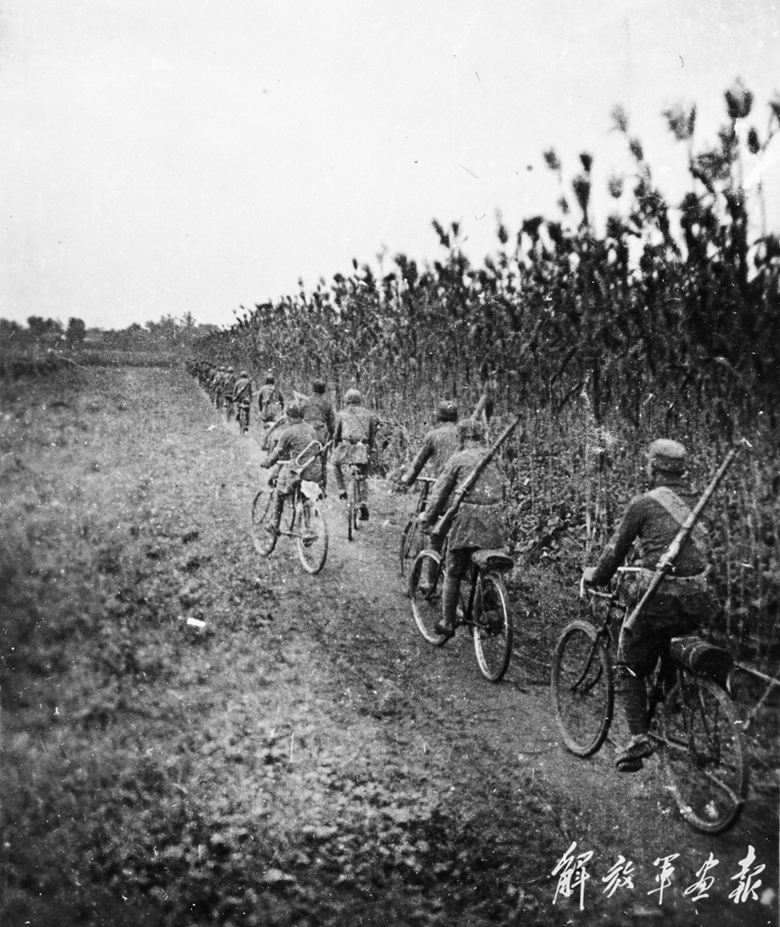 八路軍戰(zhàn)士騎自行車穿行在田野間,機(jī)動(dòng)靈活地打擊敵人。
