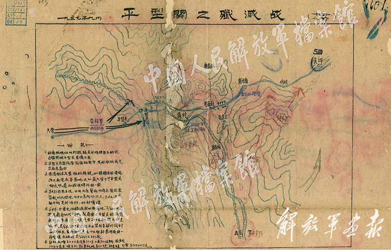 這份《平型關(guān)之殲滅戰(zhàn)》地圖,左下角的“附注”詳細(xì)記述了平型關(guān)之戰(zhàn)的背景、兵力部署、經(jīng)過和戰(zhàn)果,是研究平型關(guān)大捷的重要檔案。