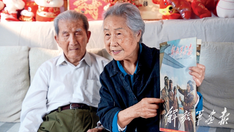 老干部陸錦榮的夫人唐潔拿出珍藏的《解放軍畫(huà)報(bào)》,講述其中刊登的家人的故事。(攝影/李 賓)
