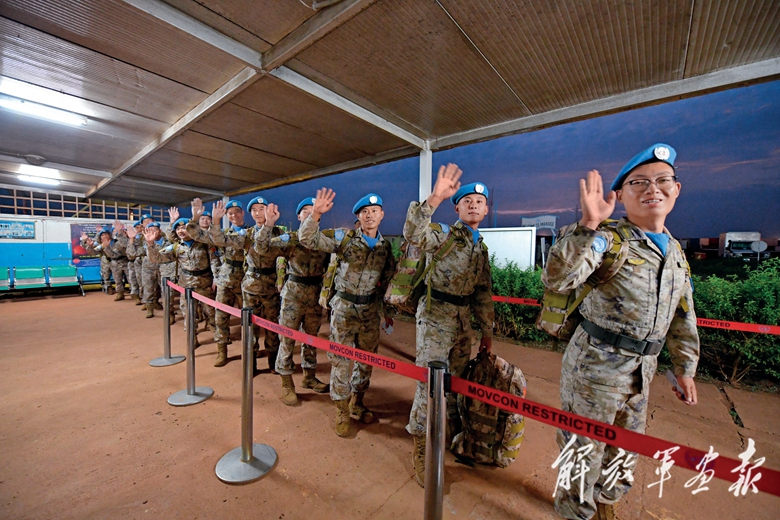 當地時間5月7日,中國首批赴阿卜耶伊維和快反分隊第一梯隊官兵準備登上歸國的飛機。