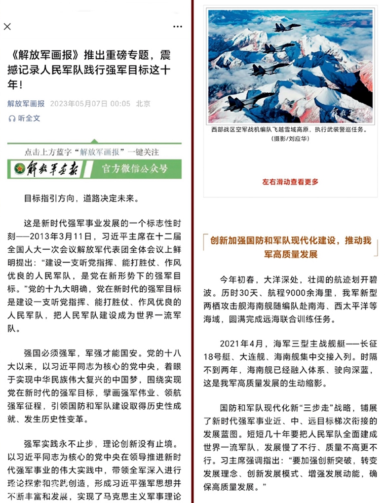 《解放軍畫報(bào) 推出重磅專題,震撼記錄人民軍隊(duì)踐行強(qiáng)軍目標(biāo)這十年!》(“解放軍畫報(bào)”官方微信公眾號2023年5月7日發(fā)布)
