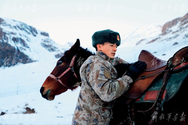 軍馬飼養(yǎng)員為戰(zhàn)友巡邏備馬。