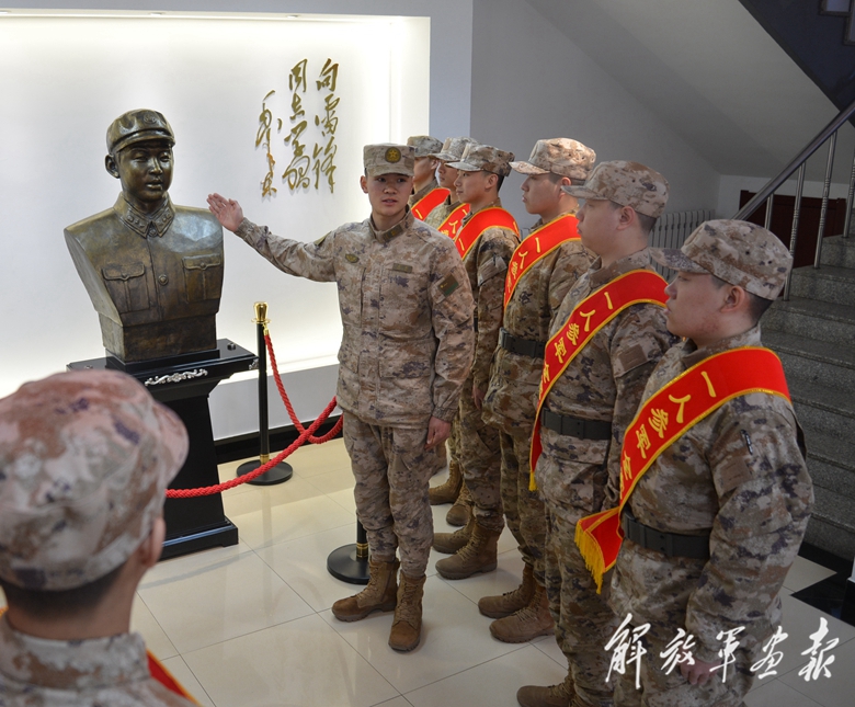 組織預(yù)定新兵到“雷鋒班”開展現(xiàn)地教育,“雷鋒班”原副班長蔣辦(右三)講述雷鋒故事。