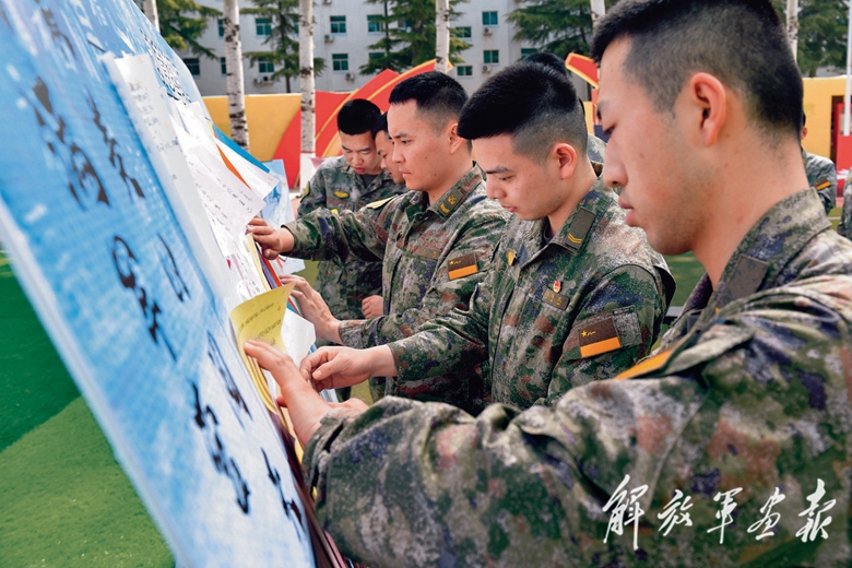 4月17日,火箭軍某部開展讀書學(xué)習(xí)活動。圖為官兵張貼讀書心得。(攝影/陳世鋒)