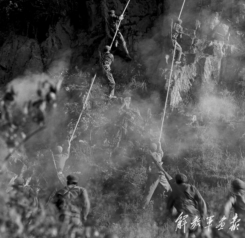 “硬骨頭六連”官兵發(fā)揚(yáng)“硬骨頭精神”,苦練攀登技術(shù)。(攝影/胡寶玉 徐 潔 刊于《解放軍畫(huà)報(bào)》1977年8月號(hào))
