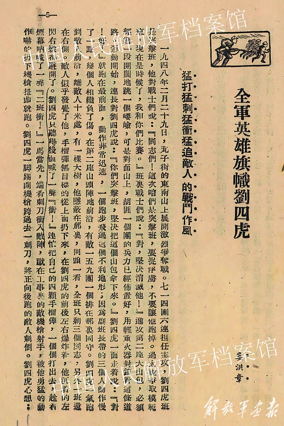1948年2月,解放戰(zhàn)爭(zhēng)由內(nèi)線反攻轉(zhuǎn)入外線進(jìn)攻,西北野戰(zhàn)軍為粉碎敵人的機(jī)動(dòng)防御部署,在陜東宜川這一戰(zhàn)略要地采取“圍城打援”戰(zhàn)術(shù),于瓦子街設(shè)伏,使國(guó)民黨29軍陷入我軍包圍圈。2月29日,為堵住敵軍南逃的唯一退路,時(shí)任西北野戰(zhàn)軍358旅714團(tuán)6連(該連1964年被國(guó)防部授予“硬骨頭六連”榮譽(yù)稱號(hào))2班班長(zhǎng)的劉四虎奉命帶領(lǐng)突擊班攻取敵軍搶占的瓦子街東南山高地。戰(zhàn)斗非常殘酷,檔案中記載:“敵軍、師、旅、團(tuán)長(zhǎng)親自督戰(zhàn),以車(chē)輪戰(zhàn)的方式,向我輪番不息地反擊(每次反擊的兵力多則兩連,少則一排)。反擊之后,即組織強(qiáng)大炮火,向我陣地猛擊。從二十九日下午二時(shí)起,至晚十時(shí)許,總共反沖三十余次之多?!?/span>劉四虎所在的714團(tuán)與敵肉搏激戰(zhàn),在不到200平方米的陣地上,斃敵近千名。最后沖鋒時(shí), 6連全連140人只剩13人,突擊班8人只剩劉四虎1人。為爭(zhēng)奪高地,他孤身沖入敵陣,一邊閃躲著避開(kāi)敵人的手榴彈,一邊將自己僅剩的4顆手榴彈一個(gè)個(gè)扔出去,趁著煙霧大喊一聲“2班沖!”便端著刺刀刺向敵人,敵軍被他的勇猛嚇得扭頭就跑。