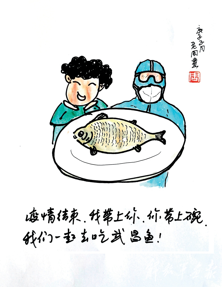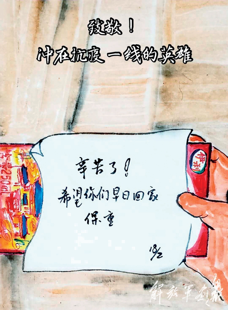 在工作中,蘇霞時(shí)時(shí)刻刻被身邊的溫暖故事感動(dòng)著,為全國人民眾志成城打贏疫情防控阻擊戰(zhàn)的決心而振奮。為了激勵(lì)患者,也為了給辛苦工作的醫(yī)療隊(duì)?wèi)?zhàn)友加油,她萌生了創(chuàng)作一組勵(lì)志漫畫的想法。通過電話和微信,她將創(chuàng)意告訴了擅長繪畫的戰(zhàn)友周樹林和自己的女兒張?zhí)K緣,并請他們進(jìn)行繪畫創(chuàng)作。這組通俗易懂、溫馨感人的漫畫創(chuàng)作完成后,被后方醫(yī)院印刷成精美的畫頁,并以最快的速度運(yùn)送到武漢抗擊疫情一線。
