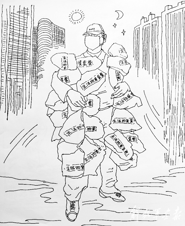 因為身邊沒有繪畫工具,馬國旗就使用鋼筆和復(fù)印紙這兩樣簡易工具,創(chuàng)作抗疫題材速寫作品。2個月來,他創(chuàng)作了近百張速寫畫,這些作品題材豐富,主題鮮明,線條流暢,各種人物躍然紙上、栩栩如生。