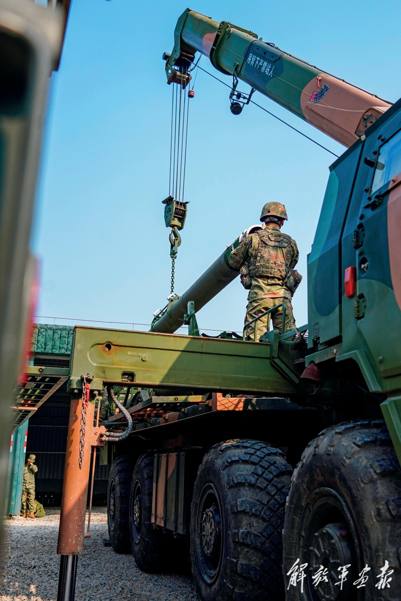 東部戰(zhàn)區(qū)陸軍某炮兵旅官兵進(jìn)行火箭彈吊裝。(攝影/韓學(xué)揚)