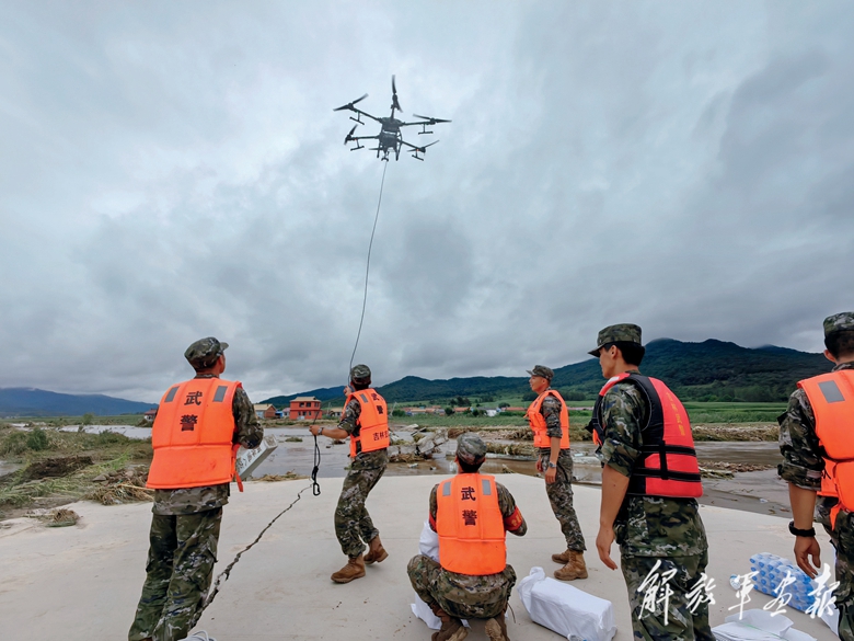 天上,無人機(jī)盤旋偵察,直升機(jī)空投物資;水上,沖鋒舟疾速前行,重型支援橋架起通途;陸上,解放軍、武警部隊(duì)官兵和民兵戰(zhàn)洪峰、護(hù)堤壩、闖“孤島”、救傷員……