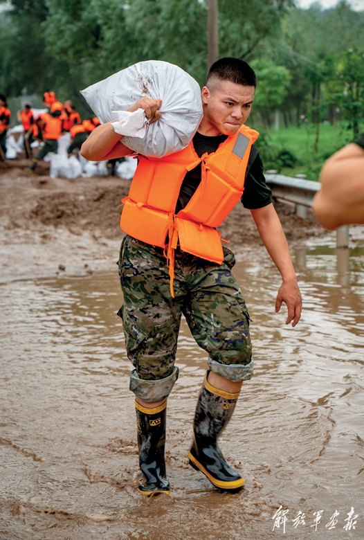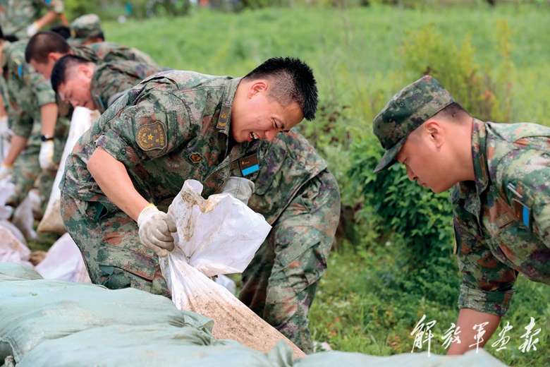 眼前是奔涌而來的洪流,身后是鱗次櫛比的樓房。咆哮的洪水一次次沖擊堤壩,年輕的官兵們一次次沖向大堤,手提肩扛、壘筑堤壩,連續(xù)奮戰(zhàn)17個(gè)小時(shí),裝填10萬余個(gè)沙袋,加固堤壩2500多米。洪峰過去,城鎮(zhèn)安然。
