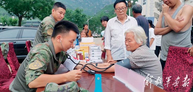 8月6日,陸軍第82集團(tuán)軍某旅官兵攜帶物資徒步進(jìn)入北京市房山區(qū)史家營(yíng)鄉(xiāng)楊林水村開展救援工作。圖為官兵為村民提供醫(yī)療服務(wù)。(攝影/記者 付 語)