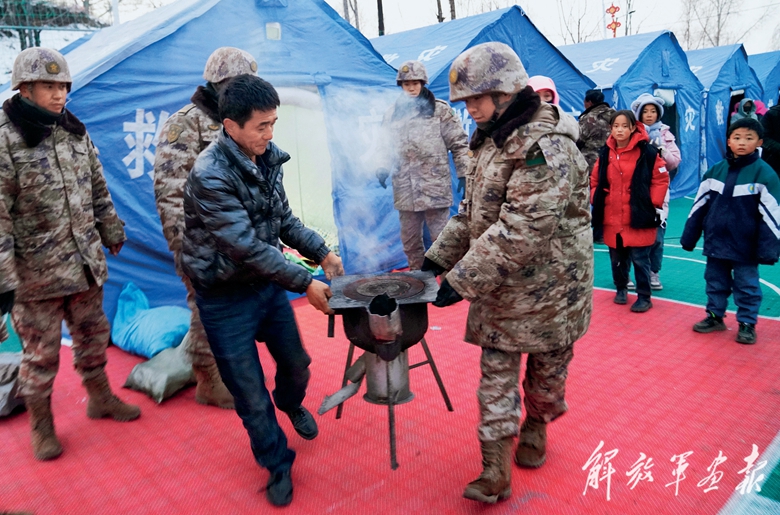 12月19日,陸軍第76集團(tuán)軍某旅官兵在甘肅臨夏州積石山縣為受災(zāi)群眾搭建帳篷、生火取暖。(攝影/特約記者 張永進(jìn))