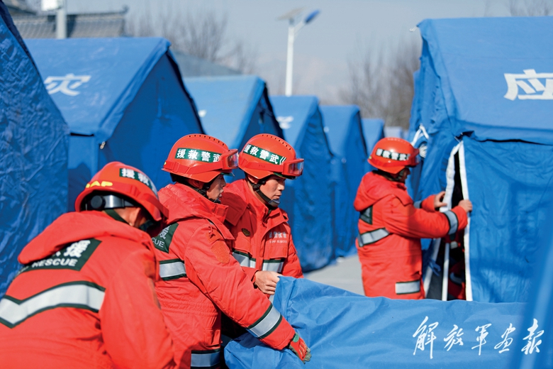 12月19日,武警甘肅總隊(duì)機(jī)動(dòng)支隊(duì)官兵在積石山縣大河家鎮(zhèn)陳家村搭建救災(zāi)帳篷。(攝影/侯崇慧)