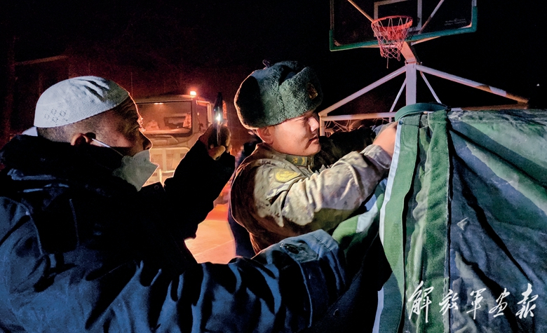 12月19日晚,陸軍第76集團(tuán)軍某旅官兵在積石山縣柳溝鄉(xiāng)袁家村為受災(zāi)群眾搭建帳篷。(攝影/苗國(guó)智)