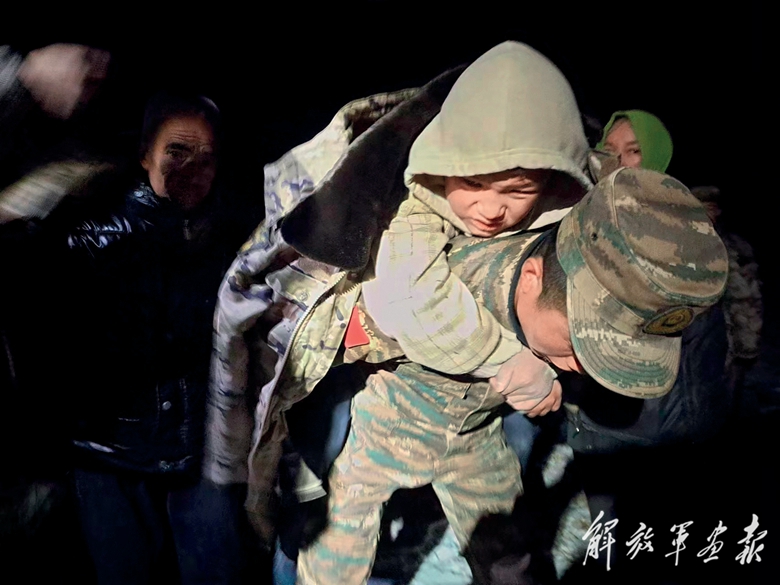 12月19日凌晨,武警甘肅總隊(duì)臨夏支隊(duì)?wèi)?zhàn)士轉(zhuǎn)運(yùn)受傷兒童。(攝影/侯崇慧)
