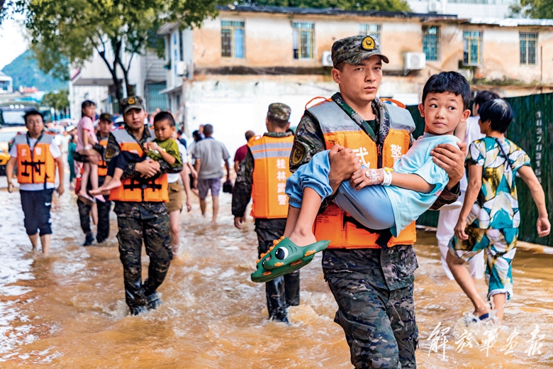 6月20日,武警廣西總隊(duì)桂林支隊(duì)官兵將受困兒童轉(zhuǎn)移至安全地帶。(攝影/施晨洲)