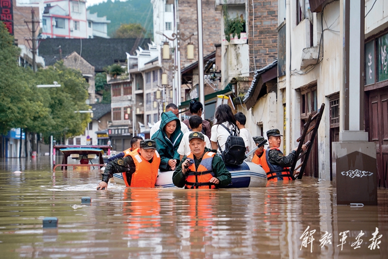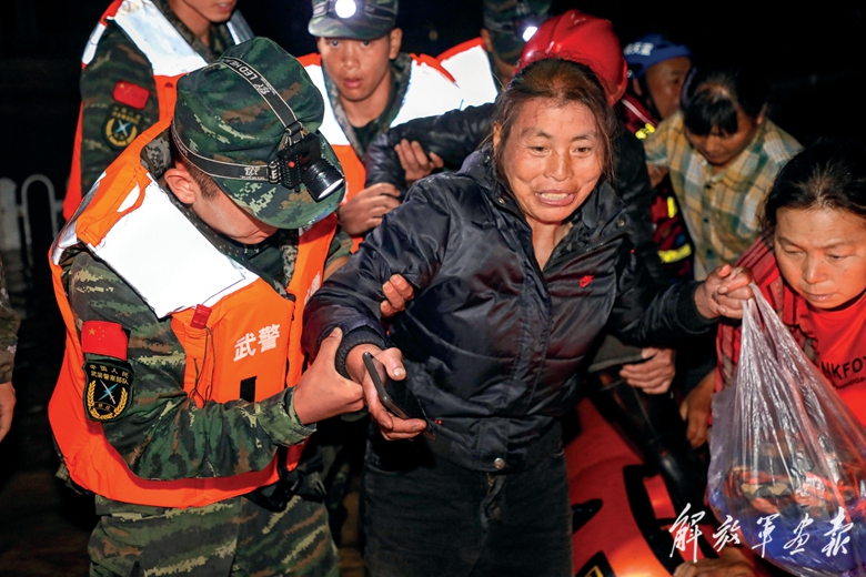 6月20日,武警安徽總隊(duì)黃山支隊(duì)官兵在歙縣轉(zhuǎn)移受災(zāi)群眾。(攝影/曹 瀏)