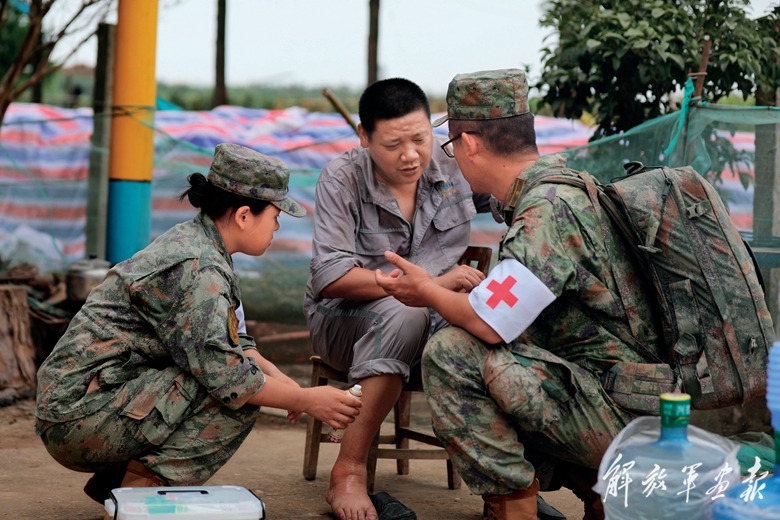 7月10日,陸軍第74集團(tuán)軍任務(wù)部隊(duì)組織醫(yī)療小分隊(duì)為受災(zāi)群眾巡診。(攝影/謝 煒)