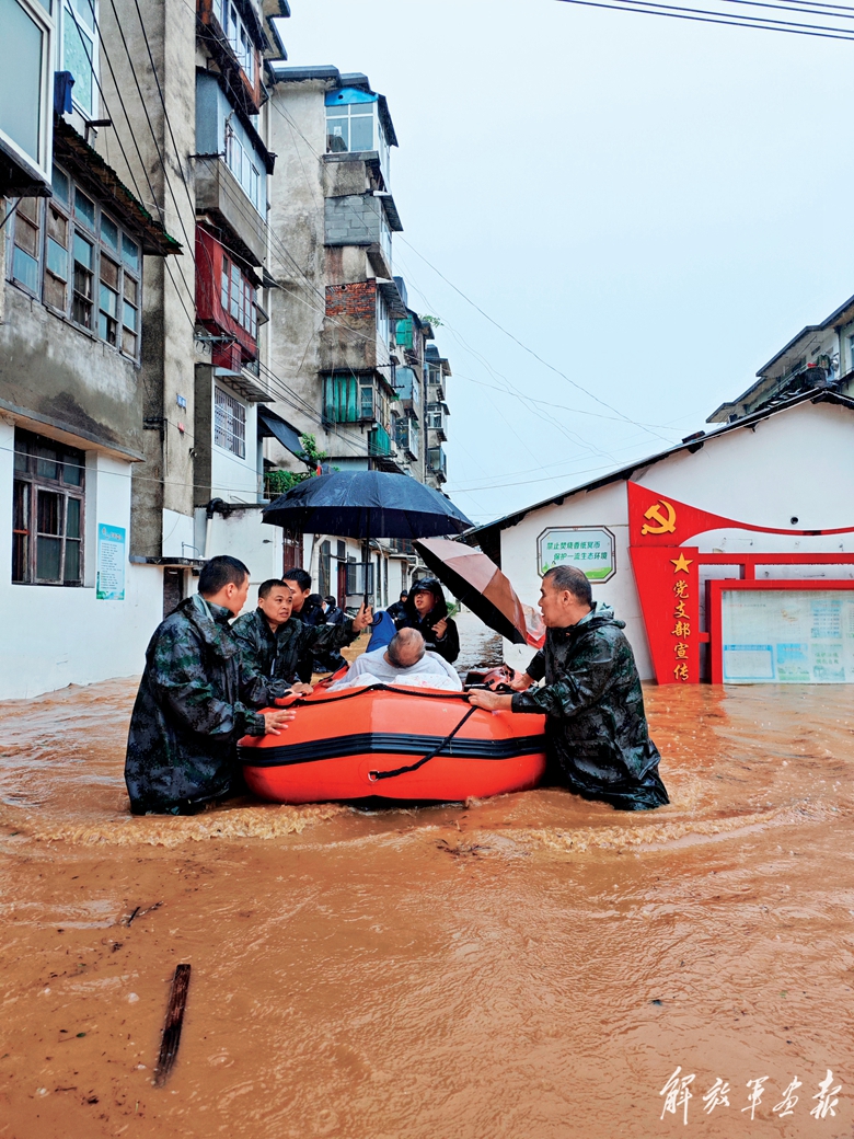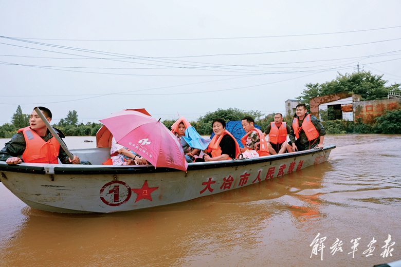 6月23日,湖北省大冶市人武部組織民兵轉(zhuǎn)移受災(zāi)群眾。(攝影/粟 毅)