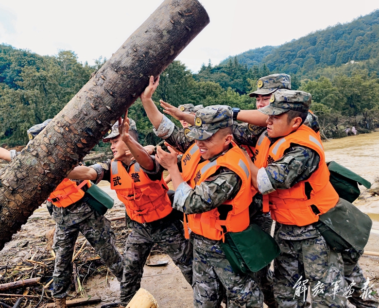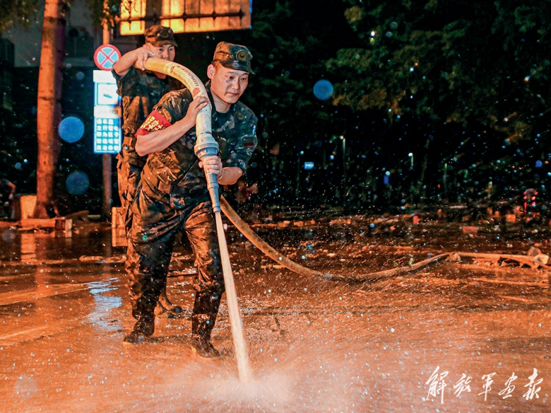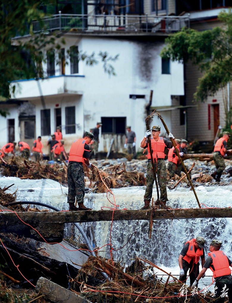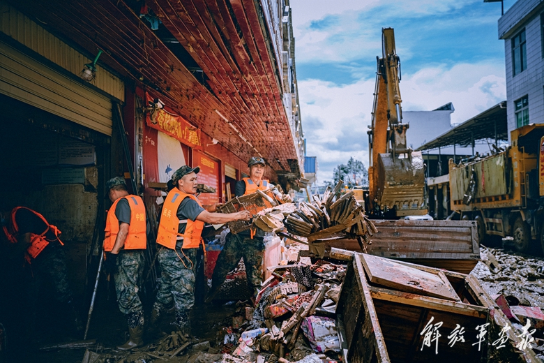 6月29日,火箭軍某部官兵在受災(zāi)地區(qū)清運(yùn)雜物、疏通道路。(攝影/李 亮)
