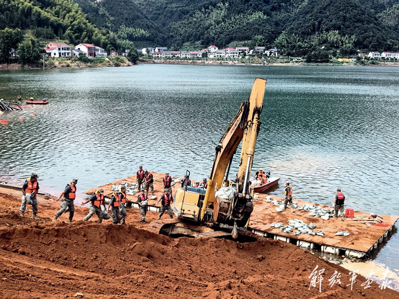 7月9日,湖南省平江縣人武部組織民兵封堵九峰水庫(kù)淺灘滲漏區(qū)域。(攝影/郭興義)