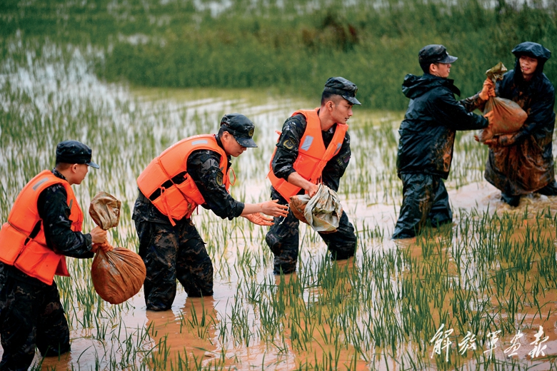 7月9日,陸軍第74集團(tuán)軍任務(wù)部隊(duì)官兵在岳陽(yáng)市君山區(qū)執(zhí)行搶險(xiǎn)任務(wù)。(攝影/黃禮明)
