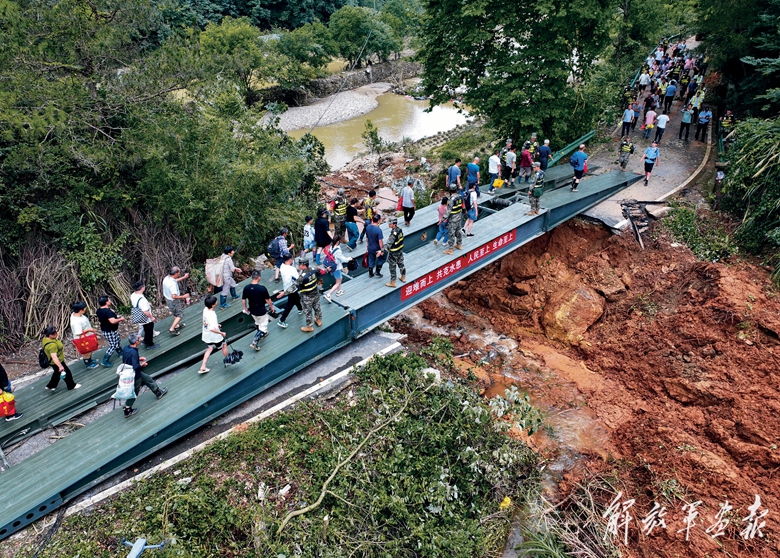 6月23日,武警第二機(jī)動(dòng)總隊(duì)某支隊(duì)官兵運(yùn)用重型機(jī)械和臨時(shí)橋梁打通歙縣紹濂鄉(xiāng)小溪村多個(gè)道路塌方點(diǎn),保證群眾出行和救援裝備的行進(jìn)通暢。(攝影/新華社記者 杜 宇)