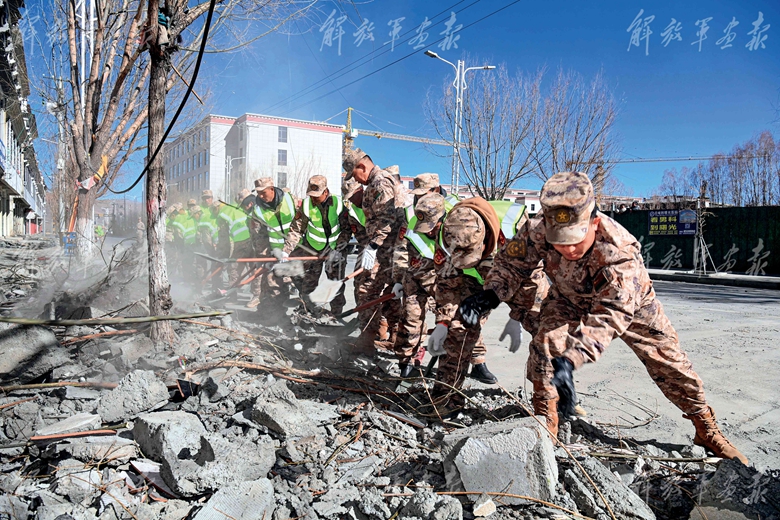 1月12日,武警西藏總隊日喀則支隊官兵在長所鄉(xiāng)古榮村清理廢墟。(攝影/何松濤)