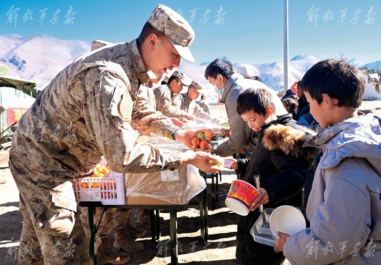 1月9日,西藏日喀則軍分區(qū)某部官兵在長所鄉(xiāng)茶江村安置點為受災群眾發(fā)放食品。(攝影/左南星)