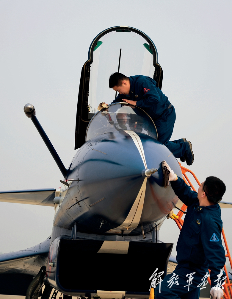 機務人員一絲不茍地對戰(zhàn)機進行檢查維護,確保裝備處于最佳狀態(tài)。飛行員接收飛機,進入座艙。地勤人員緊隨上去,在扶梯上幫助飛行員整理裝具,確認各系統(tǒng)正常。