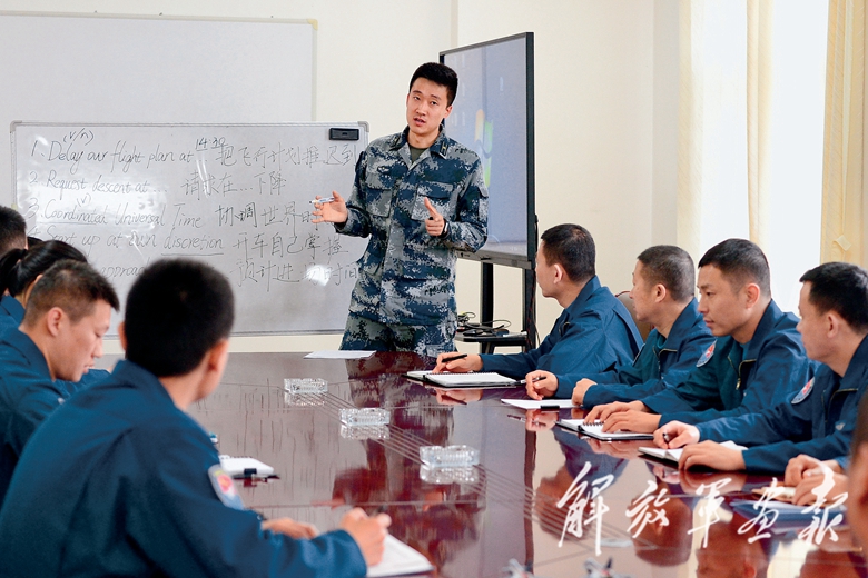 飛行員圍坐在會議桌兩邊,隊長曹振忠對面的大屏幕上,不時顯示著有關(guān)數(shù)據(jù)資料。大家爭相發(fā)言,記者完全沒有插話的機會。飛行技術(shù)研討會結(jié)束后,外事參謀見縫插針,利用半小時時間組織飛行員學習外語,提升他們參加外事活動時的溝通能力。