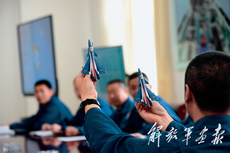 “在八機筋斗特技飛行中機群防止僚機掉隊,長機的速度很關(guān)鍵?!薄拔艺J為,僚機也要及時提醒,觀察長機是否帶減速設(shè)備向上動作”……4月9日一上班,記者一行剛踏進八一飛行表演隊辦公樓,就被會議室熱烈的討論聲所吸引。