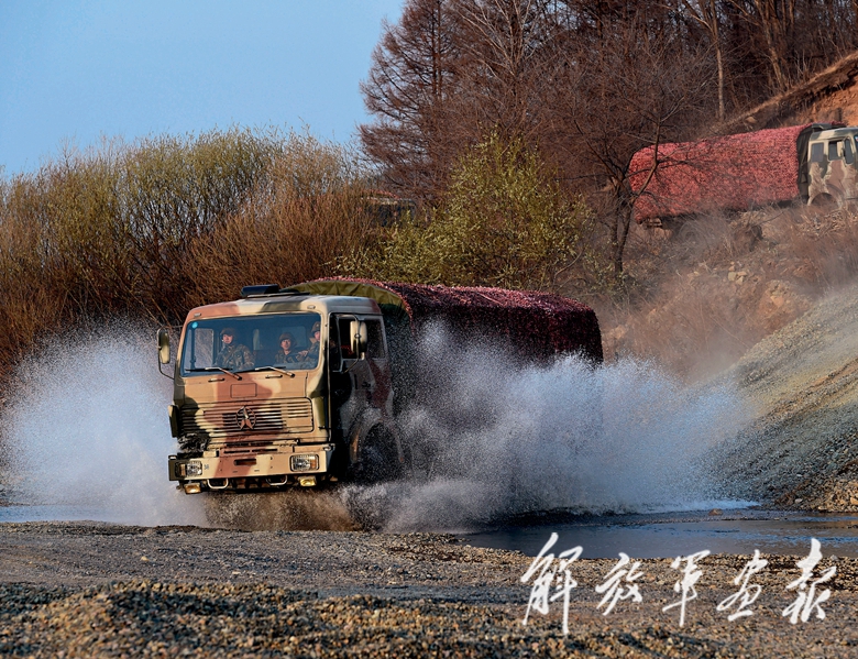 途中,駕駛員接到前方橋梁被炸、道路被毀的“敵情”。簡單商議后,他們通過車載導(dǎo)航系統(tǒng)選擇了近道,決定涉水過河??墒?,下河容易上岸難,兩輛車同時陷入泥濘。只見駕駛員從車廂中取出一捆像竹簡一樣用鐵絲串起的圓木,鋪在打滑的車前,一踩油門,卡車立刻就沖上了岸。